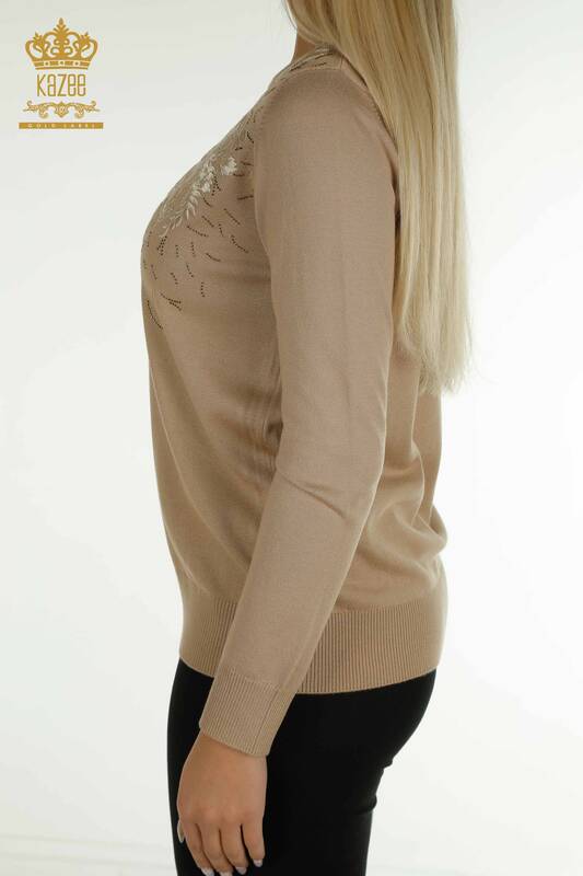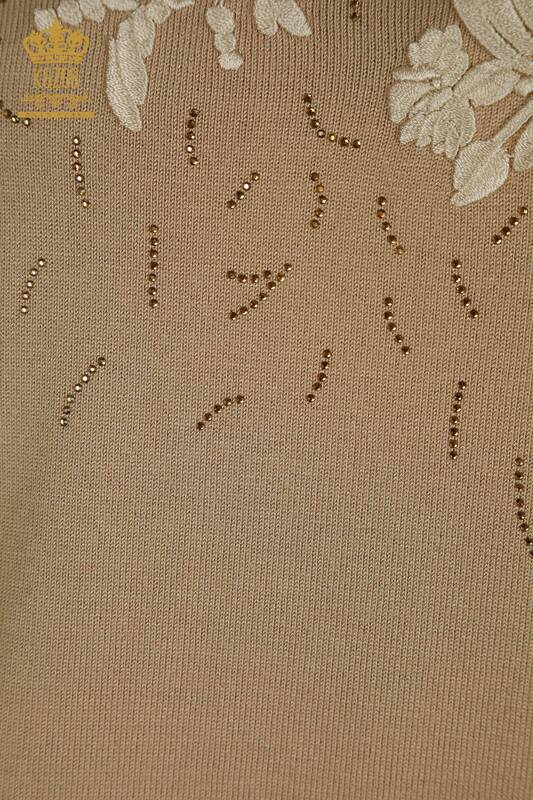 Toptan Kadın Triko Çiçek Desenli Taş İşlemeli Uzun Kol Bej - 16849 | KAZEE