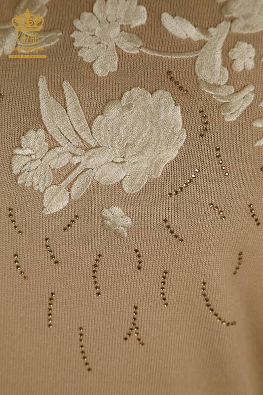 Toptan Kadın Triko Kazak Çiçek Nakışlı Bej - 16849 | KAZEE