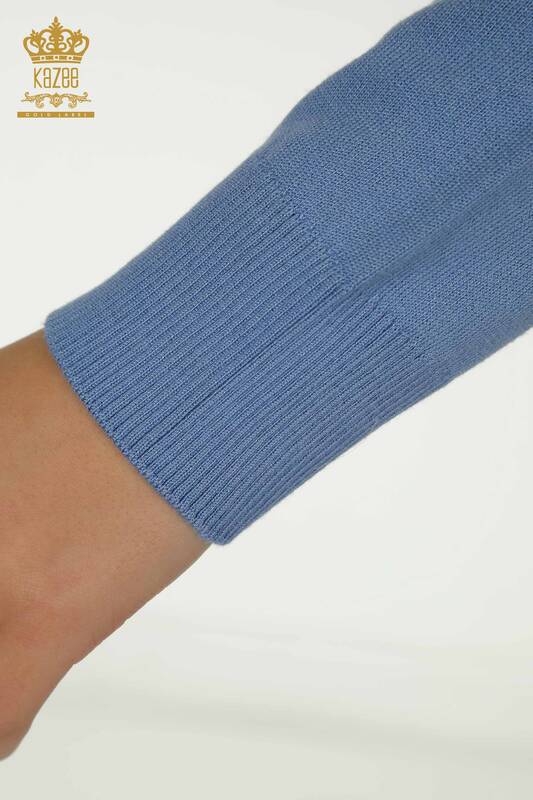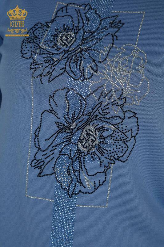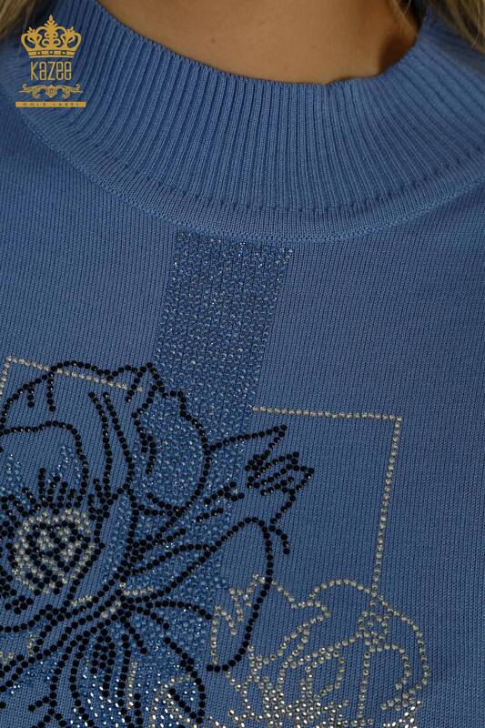 Vente en gros de tricots pour femmes pull fleur brodée pierre brodée col montant bleu - 30614 | KAZÉE