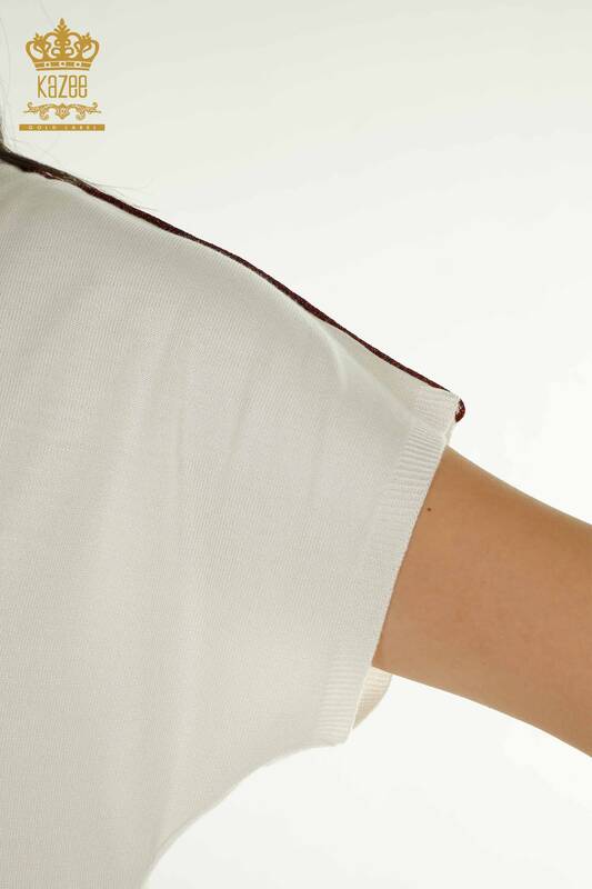Toptan Kadın Triko Kazak Desenli Taş İşlemeli Kısa Kol Ekru - 30872 | KAZEE