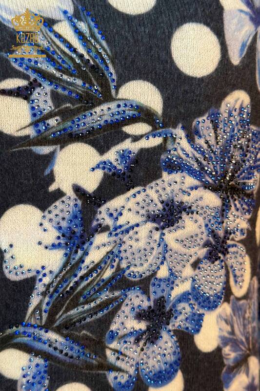 Toptan Kadın Triko Kazak Dijital Baskı Angora Taş İşlemeli Mavi - 18922 | KAZEE