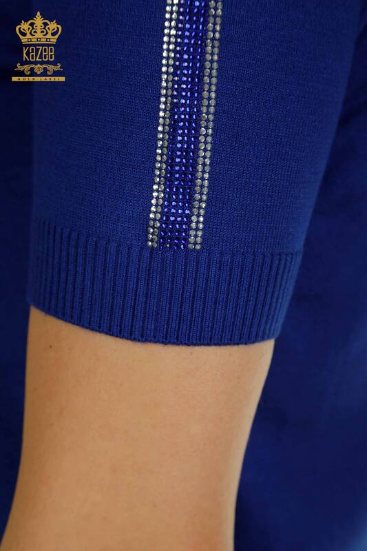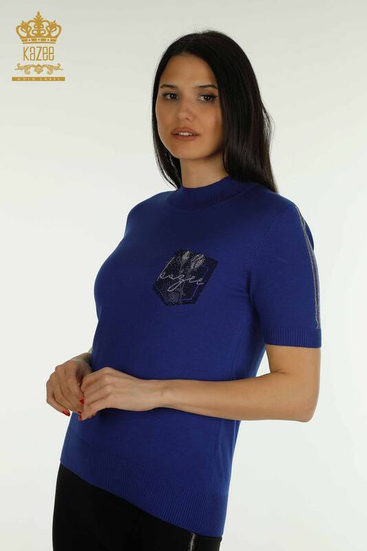 Toptan Kadın Triko Kazak Dik Yaka Taş İşlemeli Kısa Kol Saks - 30642 | KAZEE