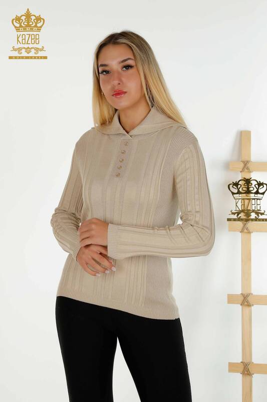 Toptan Kadın Triko Kazak Düğme Detaylı Bej - 30134 | KAZEE
