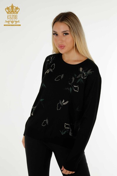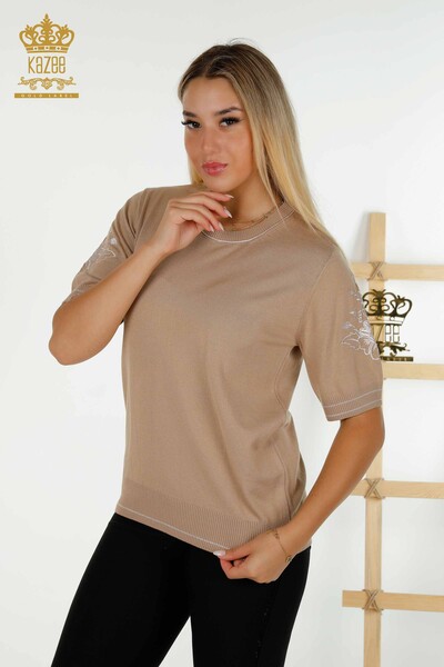 Venta al por mayor Suéter de Punto para Mujer Rosa Estampado de Piedra Bordada Beige - 16845 | KAZEE