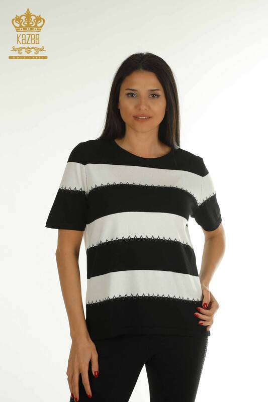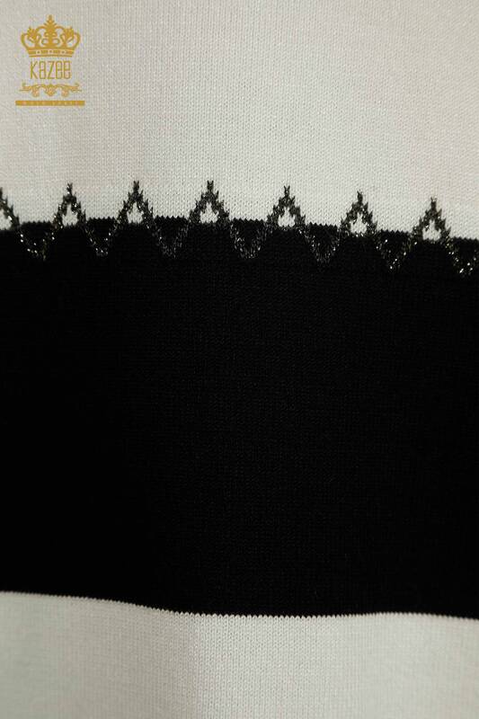 Toptan Kadın Triko Kazak İki Renk Çizgili Amerikan Model Siyah Ekru - 30351 | KAZEE