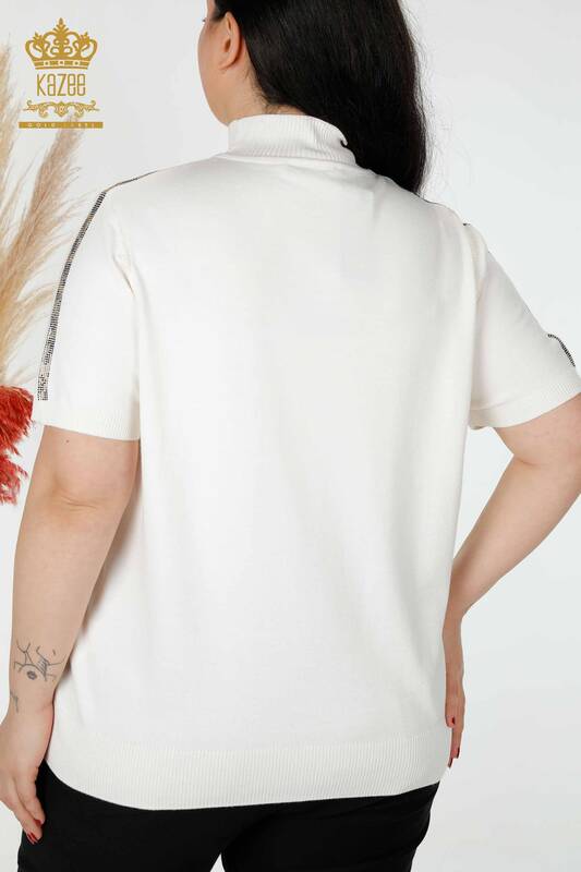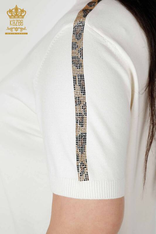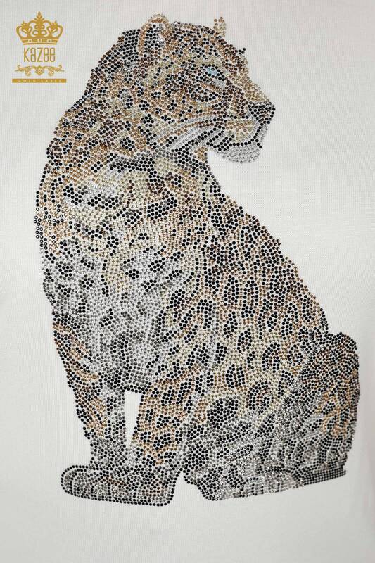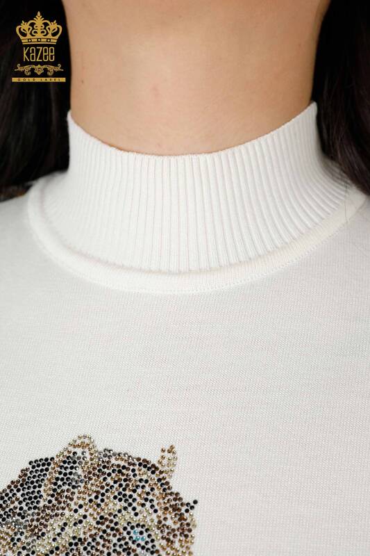 Toptan Kadın Triko Kazak Taş İşlemeli Kaplan Desenli Ekru - 16999 | KAZEE