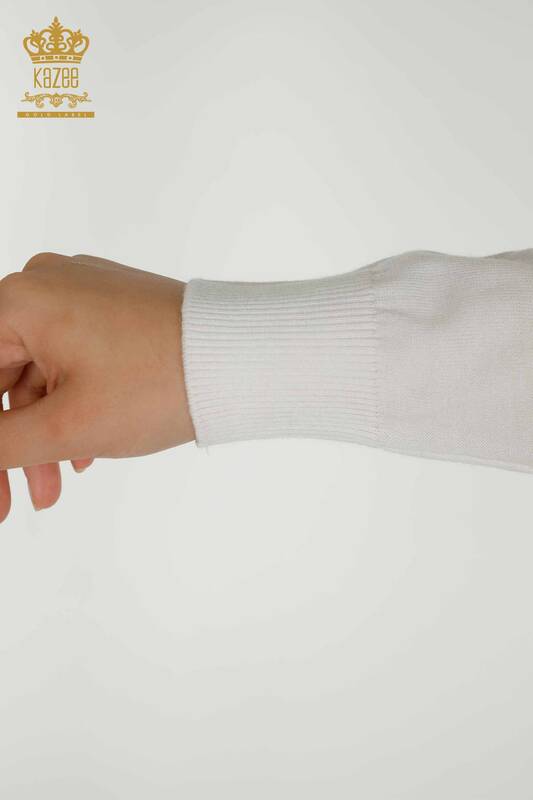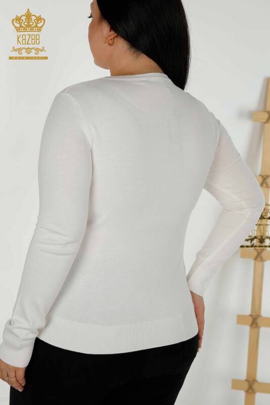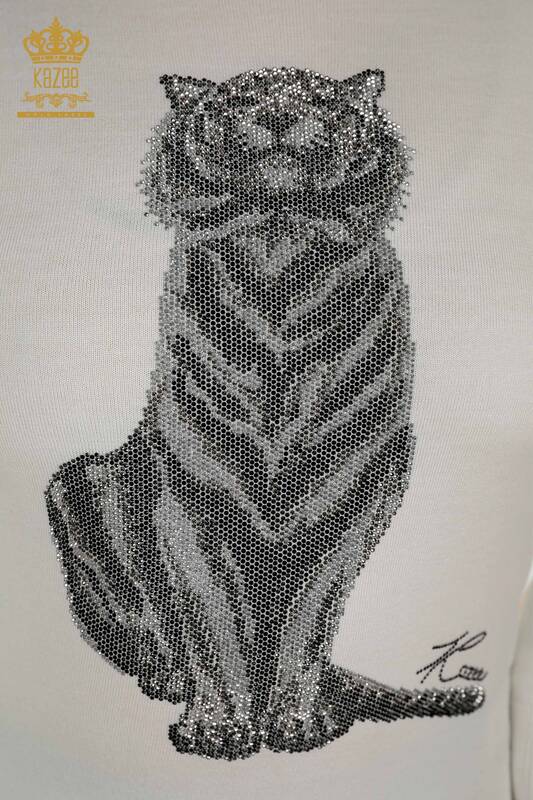 Toptan Kadın Triko Kazak Kaplan Desenli Taş İşlemeli Ekru - 30127 | KAZEE