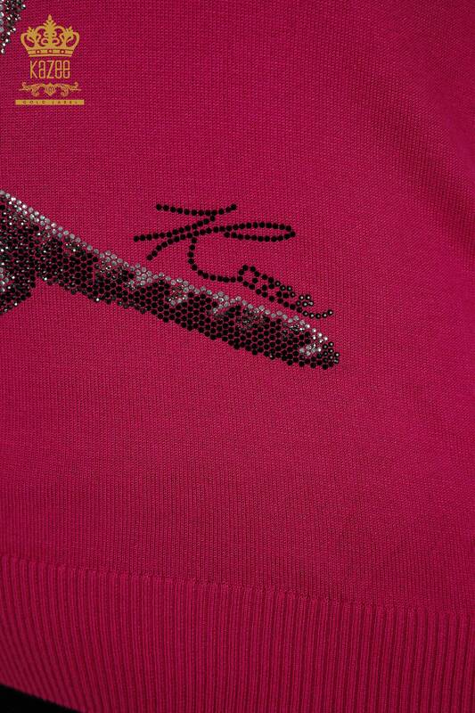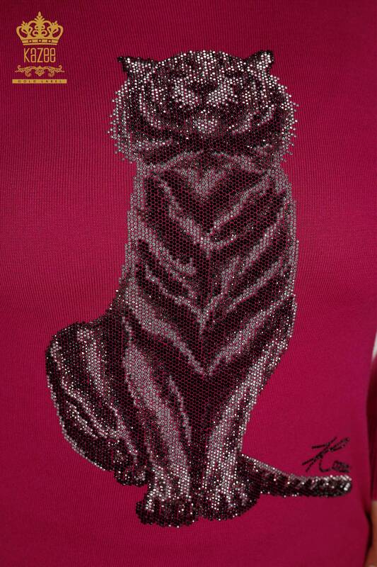 Toptan Kadın Triko Kazak Kaplan Desenli Taş İşlemeli Fuşya - 30127 | KAZEE