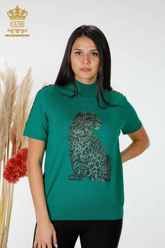 Toptan Kadın Triko Kazak Taş İşlemeli Kaplan Desenli Yeşil - 16999 | KAZEE