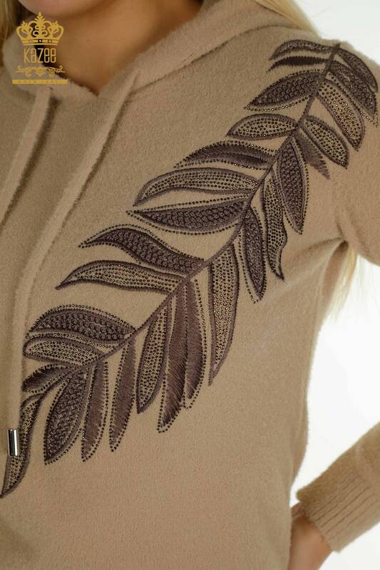 Toptan Kadın Triko Kazak Kapüşonlu Angora Yaprak Nakışlı Taşlı Bej - 40008 | KAZEE