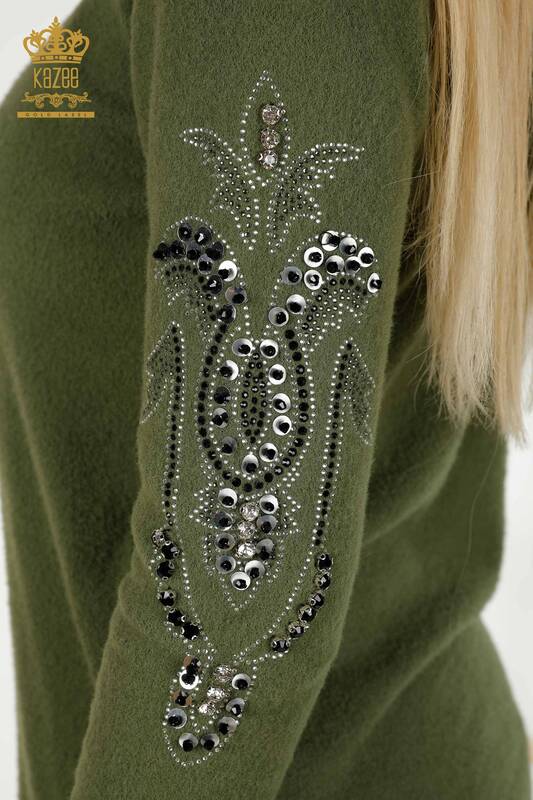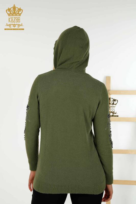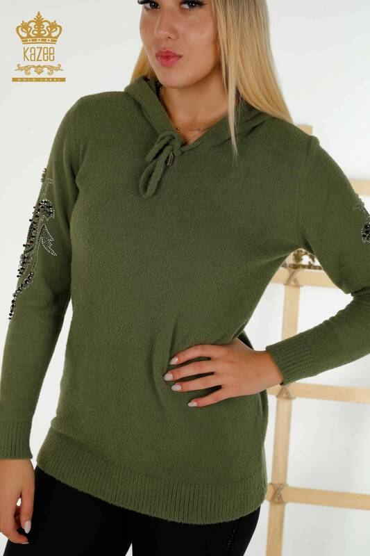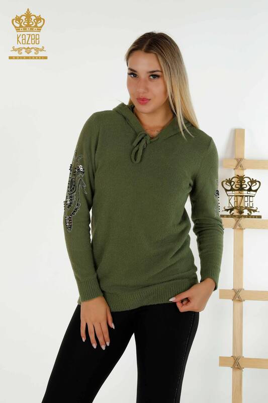Toptan Kadın Triko Kazak Kapüşonlu Kol Detaylı Taş İşlemeli Haki - 40006 | KAZEE