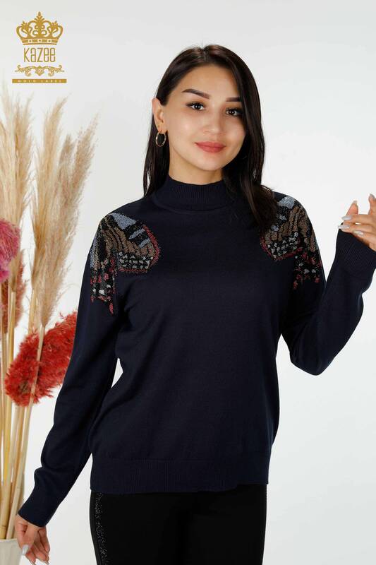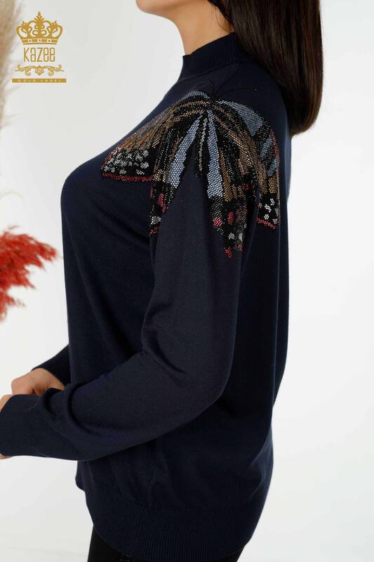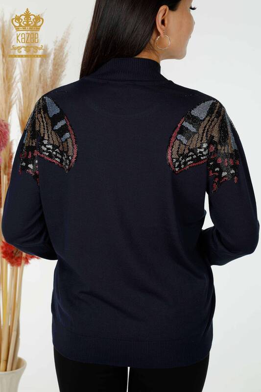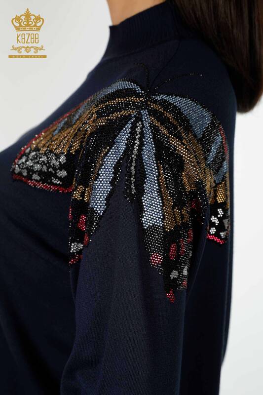 Toptan Kadın Triko Kazak Kelebek Desenli Renkli Taş İşlemeli Lacivert - 30004 | KAZEE
