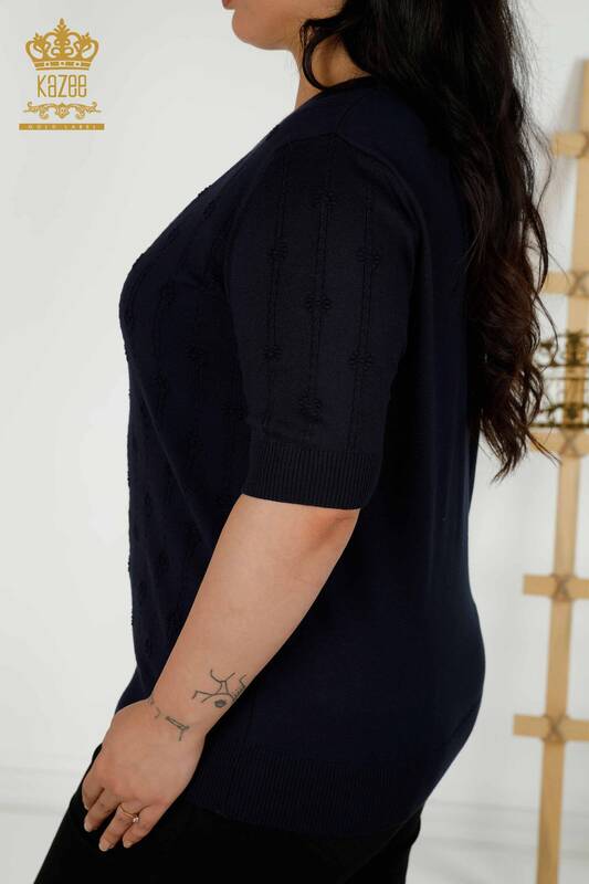 Toptan Kadın Triko Kazak Kısa Kol Kendinden Dokumalı Lacivert - 30129 | KAZEE