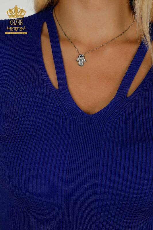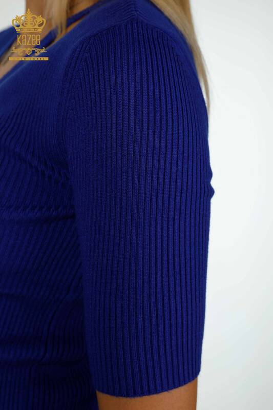 سترة نسائية تريكو بالجملة بأكمام قصيرة وياقة مفصلة ساكس - 30397 | كازي