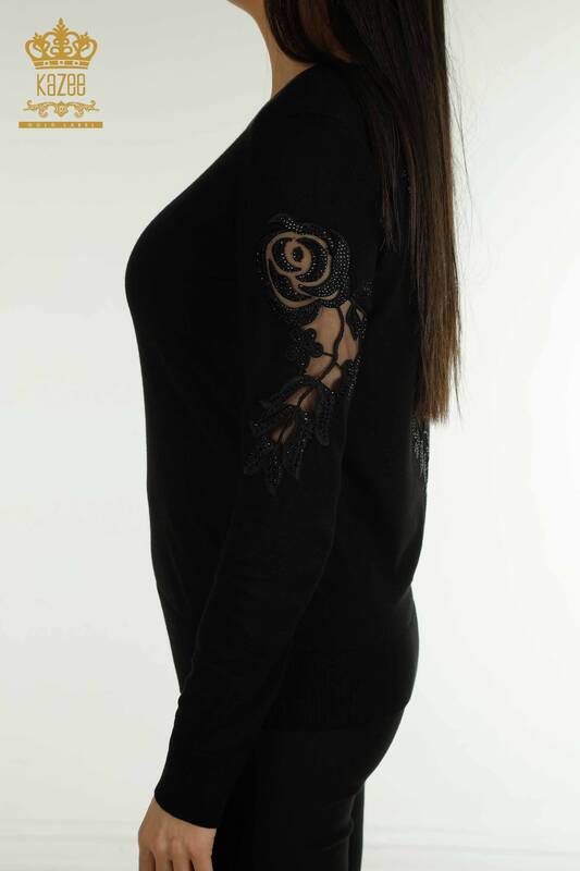 Toptan Kadın Triko Kazak Kol Gül Detaylı Siyah - 15374 | KAZEE