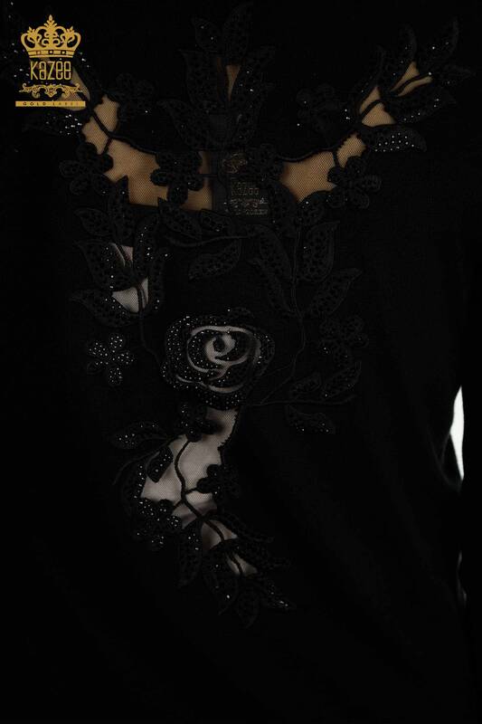 Toptan Kadın Triko Kazak Kol Gül Detaylı Tül İşlemeli Siyah - 15374 | KAZEE