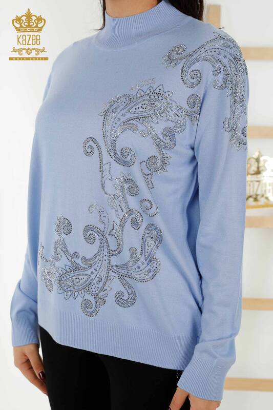 Toptan Kadın Triko Kazak Desenli Kristal Taş İşlemeli Mavi - 30013 | KAZEE