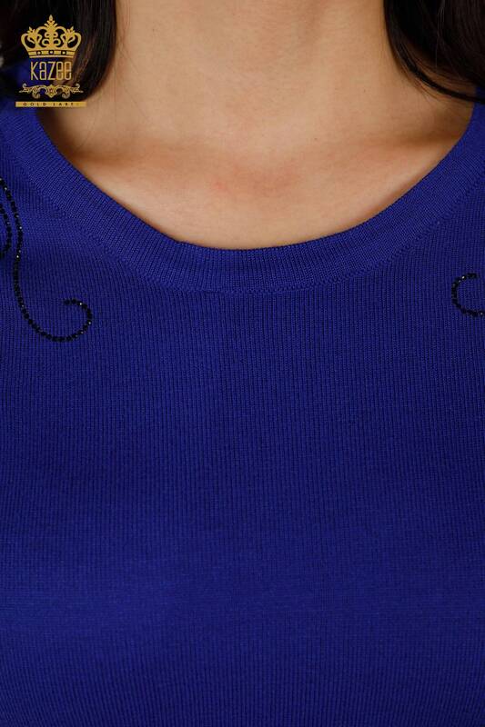 Toptan Kadın Triko Kazak Kristal Taş İşlemeli Saks - 30210 | KAZEE