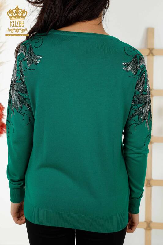 Toptan Kadın Triko Kazak Omzu Çiçek Nakışlı Taş İşlemeli Yeşil - 30210 | KAZEE