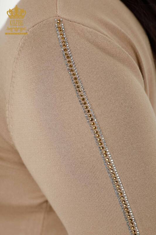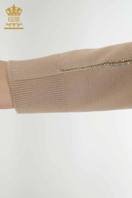 Toptan Kadın Triko Kazak Kuş Desenli Renkli Taş İşlemeli Dik Yaka Vizon - 16459 | KAZEE