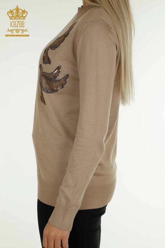 Grossiste Maille Pull Oiseau Brodé Pierre Brodée Beige - 30745 | KAZÉE