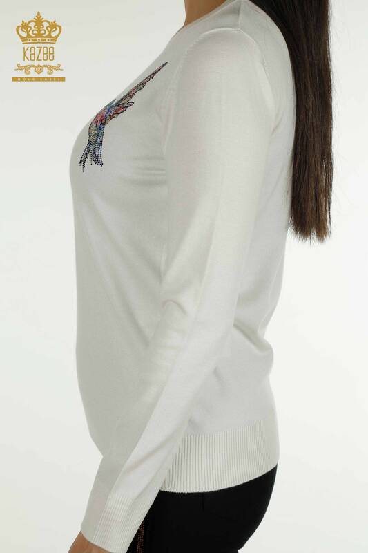 Toptan Kadın Triko Kazak Kuş Nakışlı Renkli Taş İşlemeli Ekru - 30401 | KAZEE