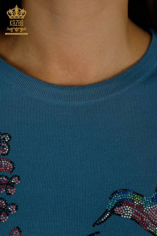 Toptan Kadın Triko Kazak Kuş Nakışlı Renkli Taş İşlemeli Mavi - 30401 | KAZEE