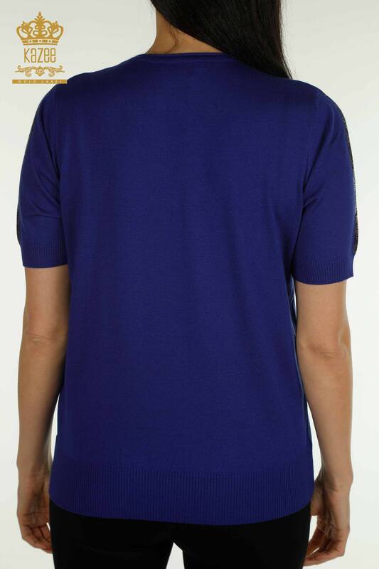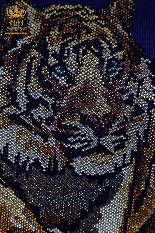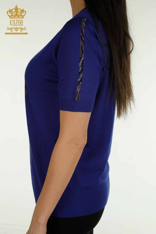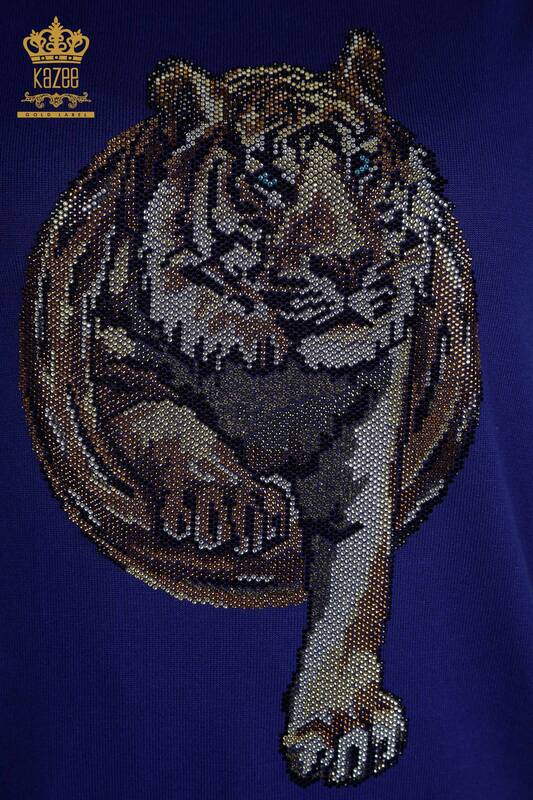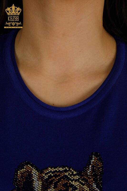 Toptan Kadın Triko Kazak Leopar Taş İşlemeli Saks - 30747 | KAZEE