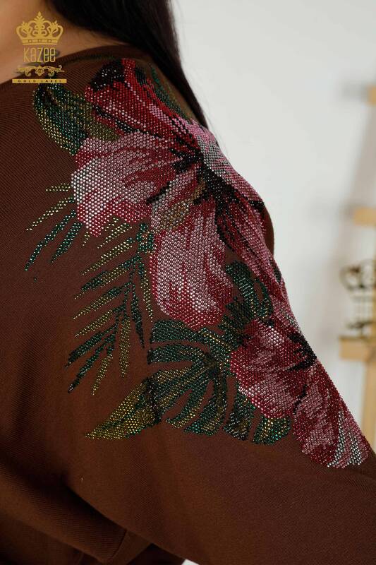 All'ingrosso Maglieria Donna Maglione Pietra Ricamato Spalla Fiore Dettagliato Marrone - 16133 | KAZEE