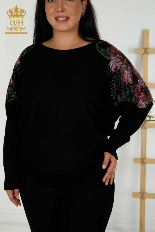 Toptan Kadın Triko Kazak Taş İşlemeli Omuz Çiçek Detaylı Siyah - 16133 | KAZEE