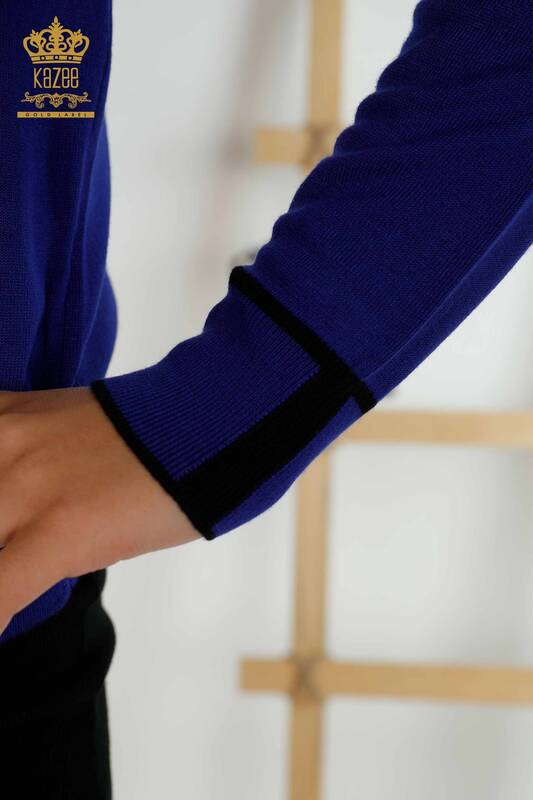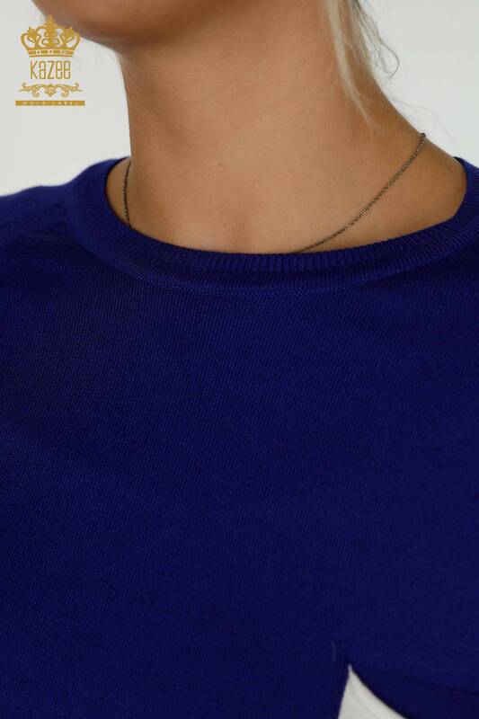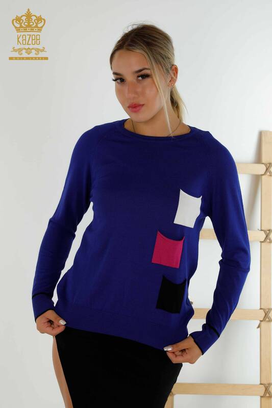 Toptan Kadın Triko Kazak Renkli Cepli Saks - 30108 | KAZEE