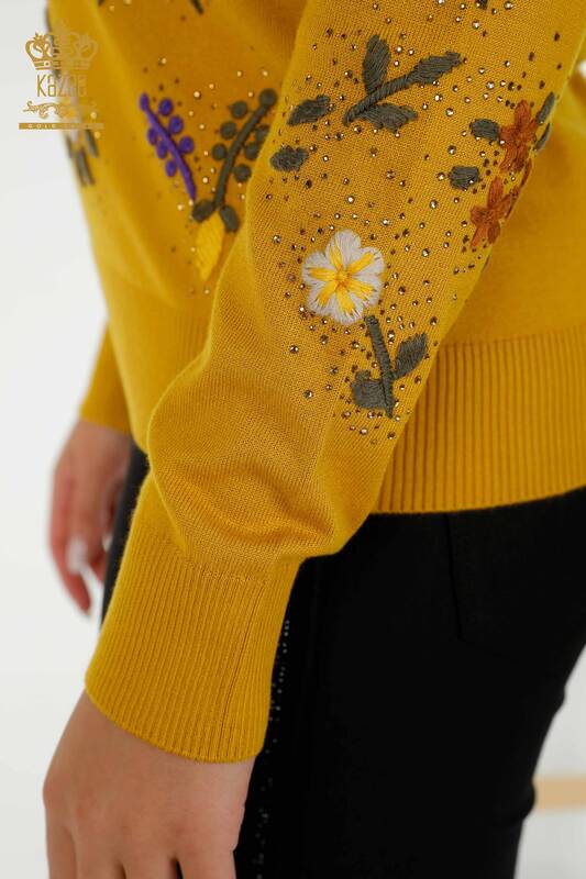 Toptan Kadın Triko Kazak Renkli Çiçek Nakışlı Taş İşlemeli Safran - 16445 | KAZEE