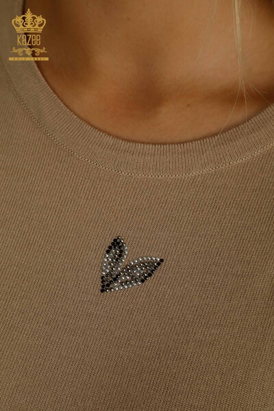 Женский трикотаж оптом Свитер с каменной вышивкой и цветочным узором Бежевый - 30471 | КАЗИ