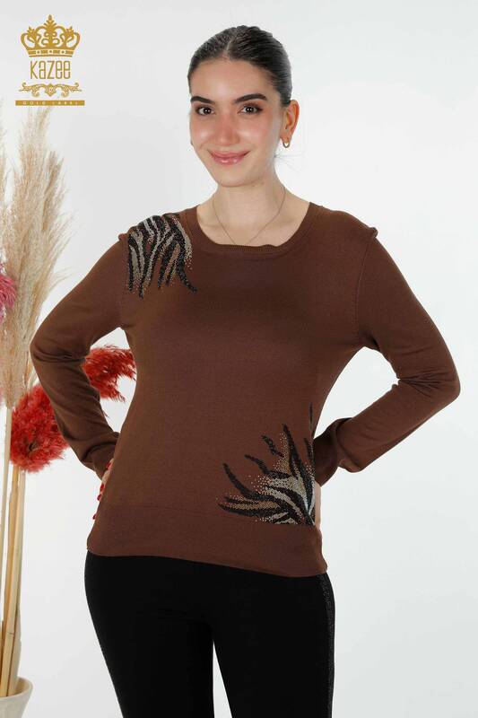Toptan Kadın Triko Kazak Taş İşlemeli Desenli Kahverengi - 16940 | KAZEE