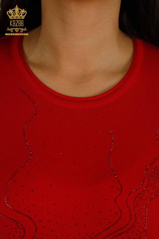 Vente en gros de tricots pour femmes pull pierre brodée modèle américain à manches courtes rouge - 30659 | KAZÉE