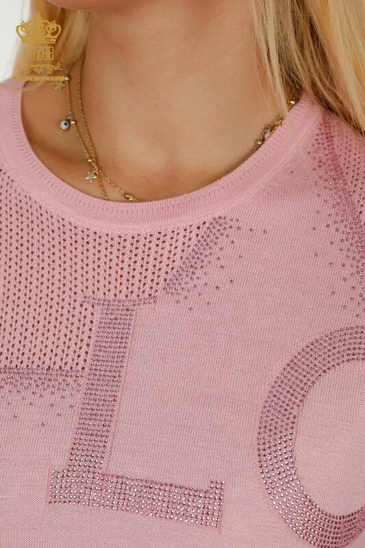 Toptan Kadın Triko Kazak Taş İşlemeli Pembe - 30501 | KAZEE