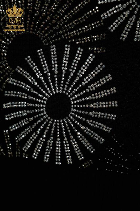 Maglieria da donna all'ingrosso maglione ricamato pietra manica corta nera - 30318 | KAZEE