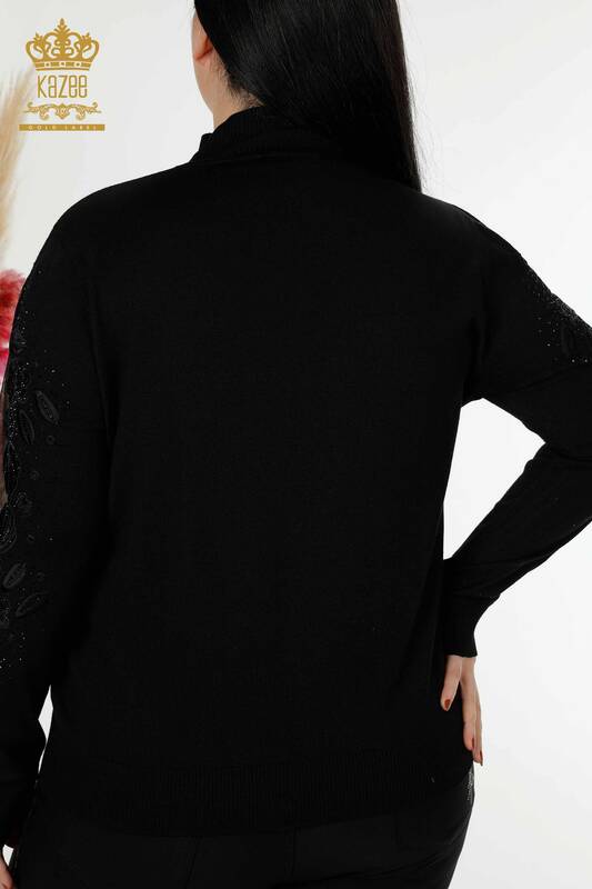 Toptan Kadın Triko Kazak Kol Tül Detaylı Taş İşlemeli Siyah - 30123 | KAZEE