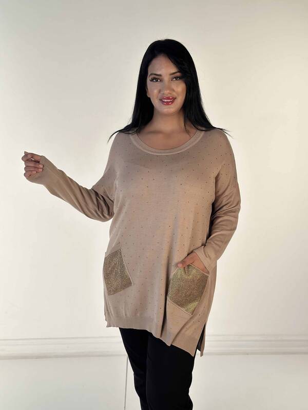 Toptan Kadın Triko Kazak Uzun Kollu Taş İşlemeli Cep Detaylı Bisiklet Yaka Bej - 30624 | KAZEE