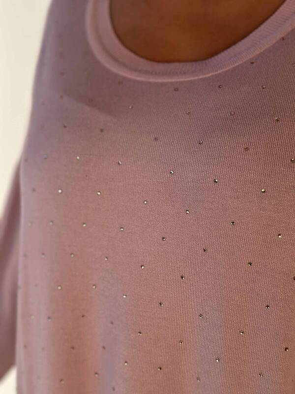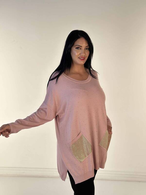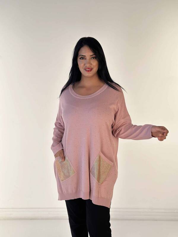 Toptan Kadın Triko Kazak Uzun Kollu Taş İşlemeli Cep Detaylı Bisiklet Yaka Pudra - 30624 | KAZEE