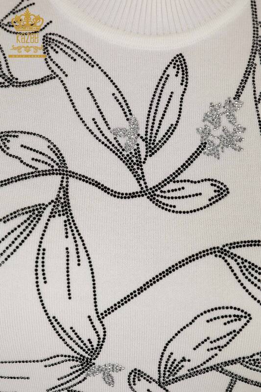 Großhandel Damen Strick Pullover Blatt gemustert Kristall Stein bestickt Ecru - 30240 | KAZEE