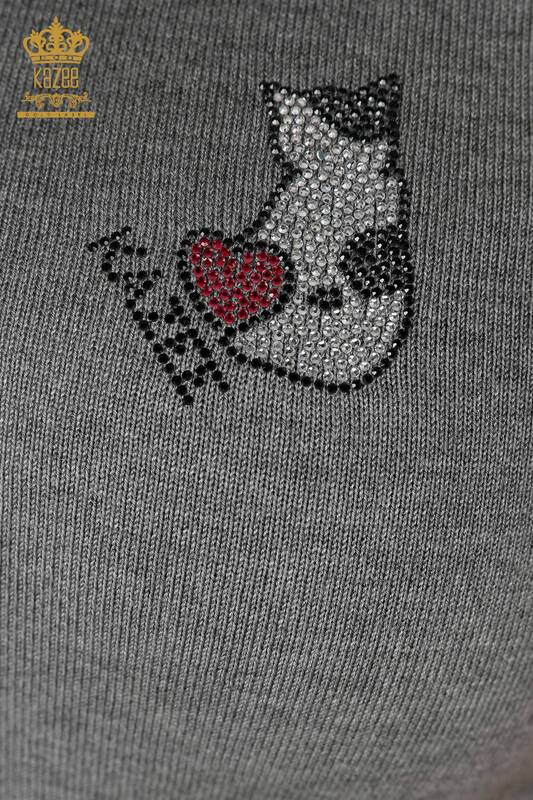 Toptan Kadın Triko Kedi Desenli Kolsuz Taş İşlemeli Gri - 16902 | KAZEE