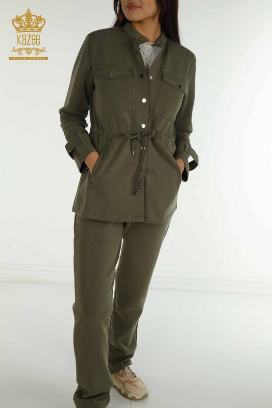 Toptan Kadın Üçlü Eşofman Takımı Düğme Detaylı Haki - 17622 | KAZEE