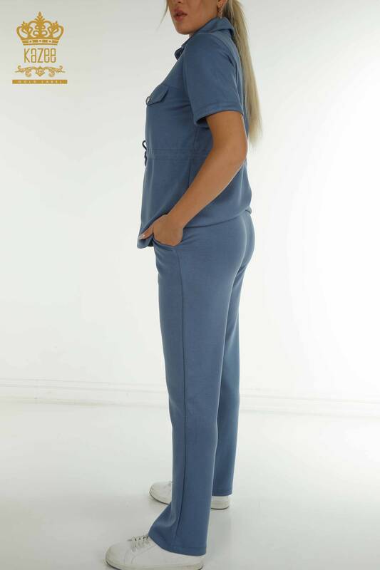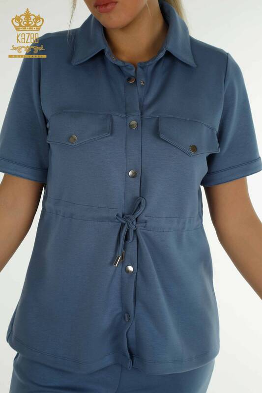 Toptan Kadın Üçlü Eşofman Takımı Düğme Detaylı Cepli Kısa Kol İndigo - 17633 | KAZEE