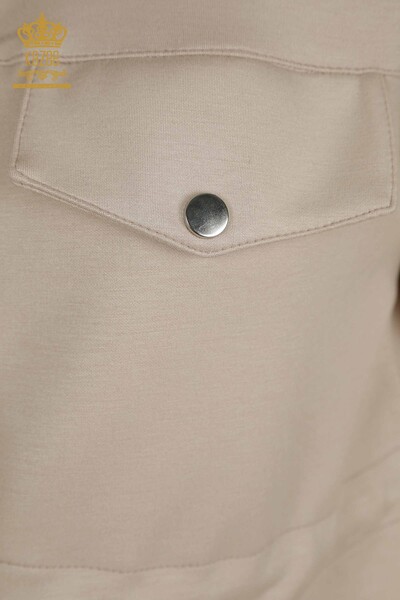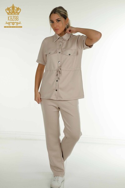 Großhandel Damen-Dreier-Trainingsanzug-Set mit Knopf und detaillierter Tasche, kurzen Ärmeln, Nerz – 17633 | KAZEE