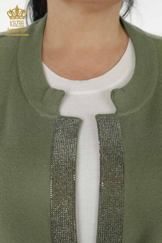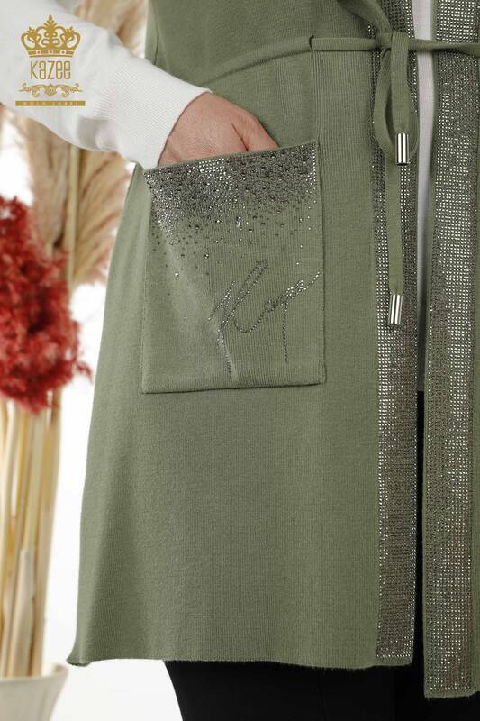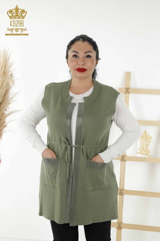 Toptan Kadın Yelek Kristal Taş İşlemeli Cepli İp Bağlamalı Haki - 30299 | KAZEE