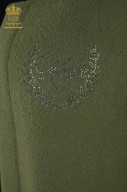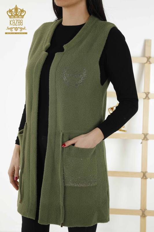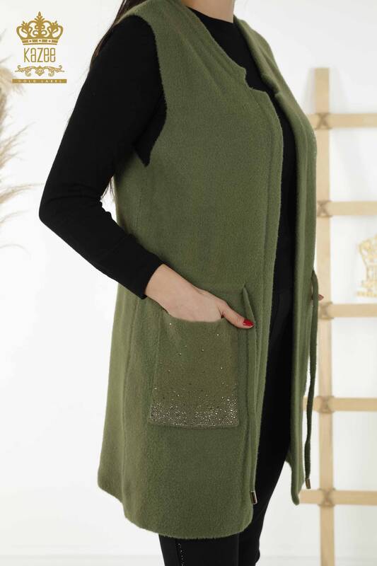 Toptan Kadın Yelek Cep Taş İşlemeli Haki - 30243 | KAZEE