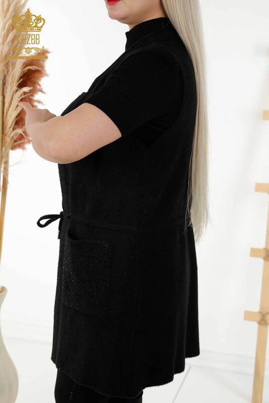 Toptan Kadın Yelek Taş İşlemeli İpli Cepli Siyah - 30246 | KAZEE