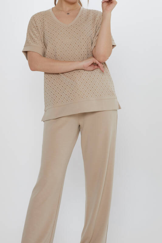 Tracksuit Set Stone Embroidered Short Sleeve Beige - 17867 | KAZEE (Set of 3 L-XL-2XL)