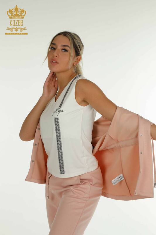 Venta al por mayor Conjunto de chándal triple para mujer con botones y bolsillo detallado de manga corta en polvo - 17633 | KAZEE